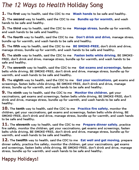 Wellness Wednesday – Week 49 December 22, 2015The Resource Center Click here to listen to 12 Ways to Health Holiday Song! Share this: Click to share on X (Opens in new window) X Click to share on Facebook (Opens in new window) Facebook Like Loading... Related